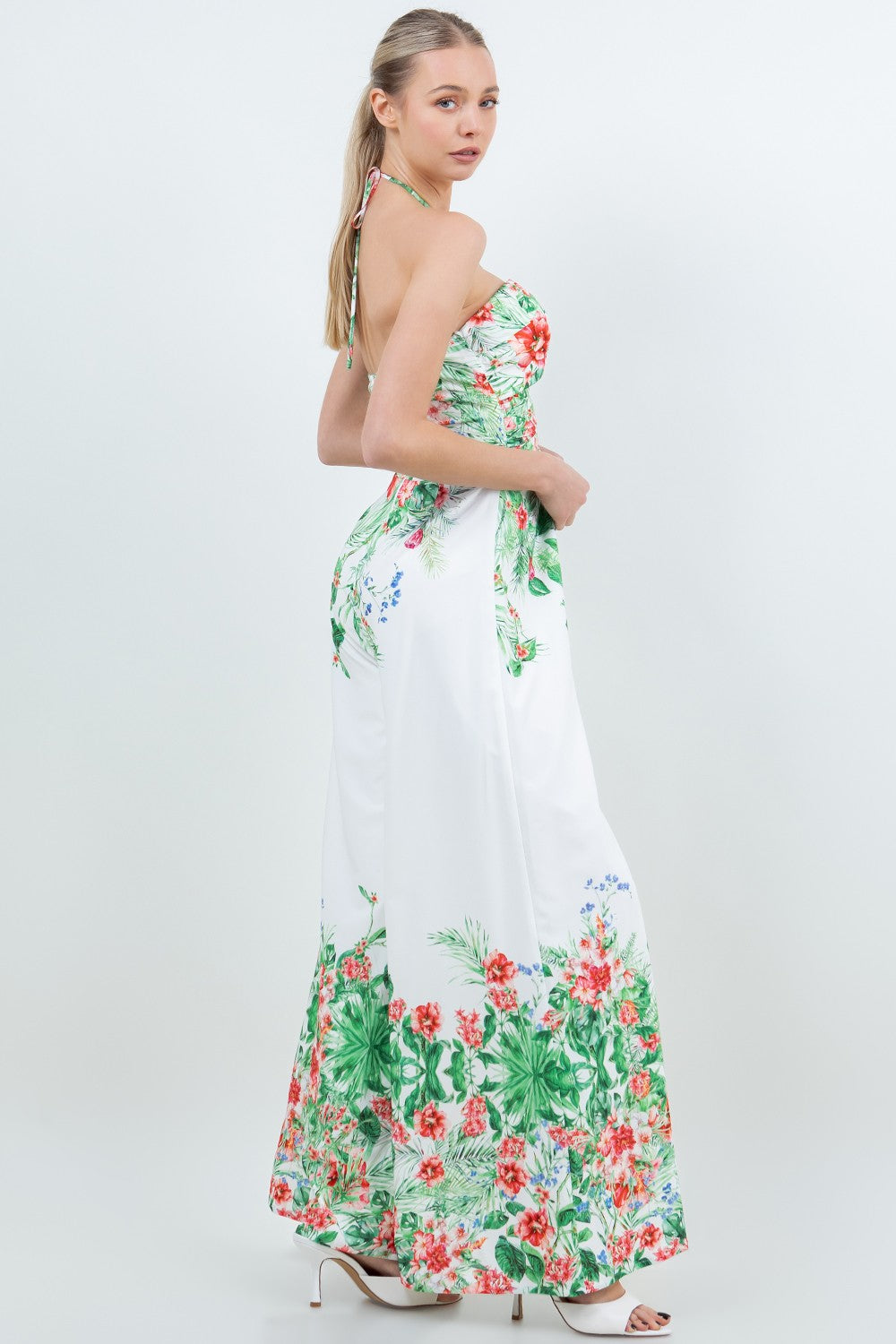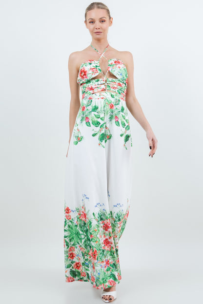 TROPICAL FLORAL POLY BORDER PRINTED X- HALTER NECK OPEN BACK ZIPPER